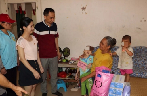 7月6日上午,探访人员驱车来到了罗定市附城镇哈娃娃幼儿园斜对面迎宾小区内特殊儿童小明的家。小明患有脑瘫、长期卧床,只能吃流食,无言语能力,平时由妈妈和外婆照顾,母亲无正式工作,无固定收入,家境贫寒。探访人员向小明外婆了解了家中近况,并鼓励她坚持阳光地面对生活。最后,探访人员送上了爱心礼物与慰问金。