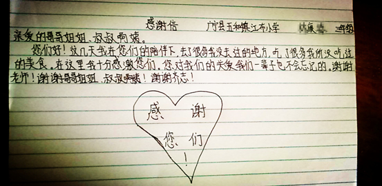 来自广宁五和镇的小康在感谢信上写到:“这几天去了很多我没去过的地方,吃了很多我没吃过的美食,在这里我十分感激你们,谢谢哥哥姐姐、叔叔阿姨。”