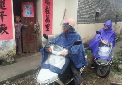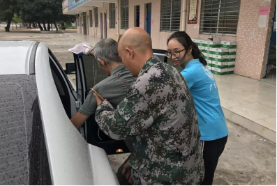 潭水镇社工站“双百”社工与村委会工作人员上门接送独居长者,将其转移到临时庇护所