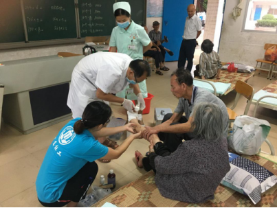 溪头镇“双百”社工协助医护人员为居民清理受伤伤口