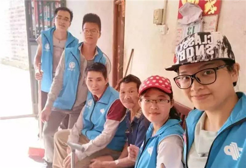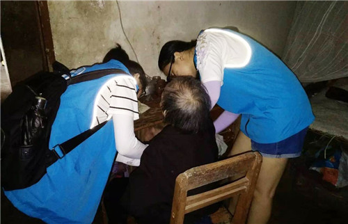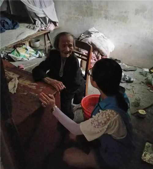 正当我们在房里找不到这位失明的老奶奶时,老伯告知我们说她在洗澡。我们感到很吃惊,老奶奶失明了,怎样解决这些生活问题呢?找到老奶奶时,正发现她坐在厕所门口艰难地穿衣服,而且是穿着反过来的衣服,我们的一位社工轻轻地走过去,微笑着轻声告诉老奶奶,说她衣服穿反了并小心地帮她重新穿好,并叮嘱她慢慢来,别急。她却说了一句让我们觉得有些悲凉的话:“急不来,(现在)老了,怕摔倒。”穿好衣服后,她让我们帮她在桶里盛半勺水。我们以为她是想要拿水洗手,弄好给她后,她却推着这盛了一丁点水的桶往前挪动着走…看到这一幕,我们的内心都被震撼了!她靠着墙,边推着桶边走,我们几次说扶她进房,她都说不用,她自己熟悉。她还告诉我们,虽然她看不到,但每天都会经过的路,早已熟悉每一个角落,还笑着说房门口放着一个箩筐和一个缸。本来我们还想提醒她注意房门口的杂物,谁知她虽失明,却心如明镜。