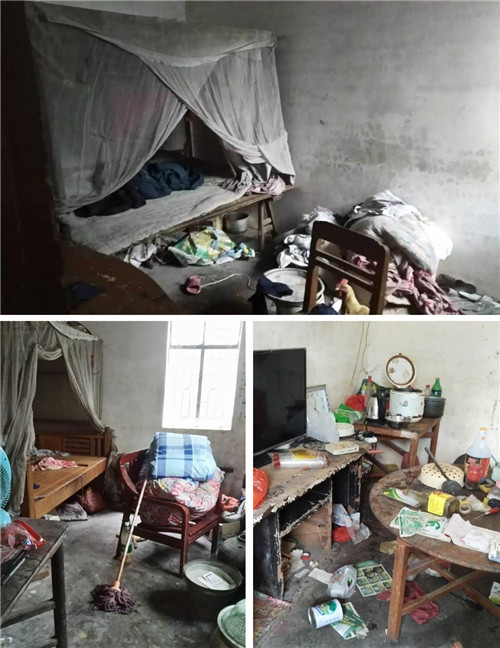 在了解廖伯家庭基本情况的同时,我们见其家里卫生环境非常恶劣,地上垃圾随处可见,衣服被子乱堆地上,食用餐具不干净......