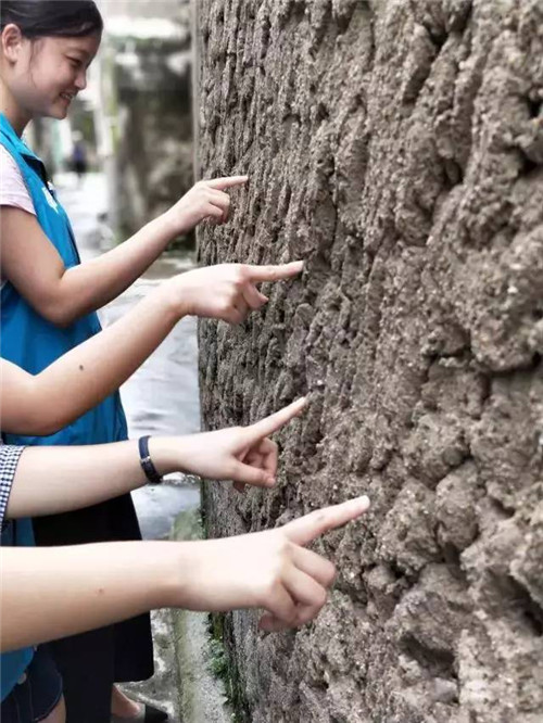 旧社会的时候,墙体历经风吹雨打,时有剥落的现象。老一辈人,用贝壳烧成灰,混上糯米糊搅拌成的泥浆来糊墙,使墙壁更加坚固,历经风霜而不倒,更形成了独特的风貌!