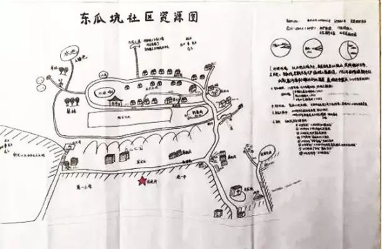 用心、用眼、用脚画社区地图 : 走访农村社区和居民社区,用脚画社区地图。东瓜坑社区是农居结合的社区,在走访的过程中,我们用心观察、逢人便问,从问社区范围开始,到介绍我们自己。一路观察社区有哪些公共康乐场所、居民聚集区等资源,比如医院、学校、教育机构以及企业小作坊等,及时记录下来。