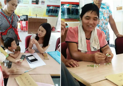 通过社工的详细介绍及解说,村民们获悉到加工该钥匙扣的风险后,表示如果能有其他手工制品代替的情况下愿意放弃加工钥匙扣,改做其他对身体无害的手工制品。但同时提出了一些要求,比如交货期不能太急,制作难度不能太高,因有些村民眼力不够。