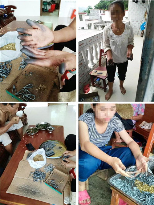 村民加工钥匙扣后的双手是沾满了灰黑色的颜色,参与生产这种钥匙扣的均为老人、妇女、儿童。我们对村民加工钥匙扣的行为表示非常的担忧。