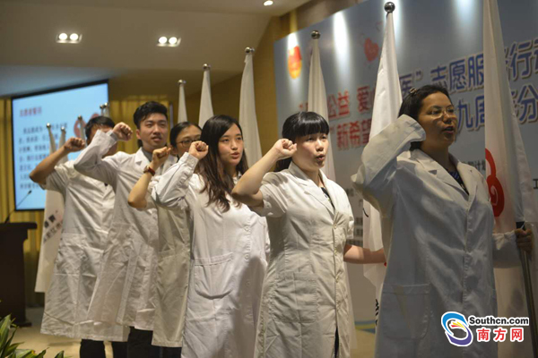 在现场,市卫计委以及团市委领导为“青春公益 爱心助医”志愿服务队授旗。