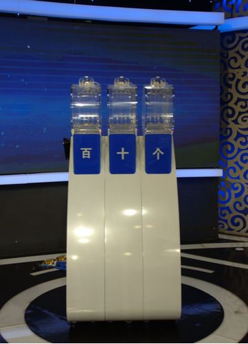 福彩“3D”摇奖机是一种气动搅拌式摇奖机,高1.50米,宽0.66米,搅拌室直径是30厘米,底座以上材质为高强度有机玻璃。