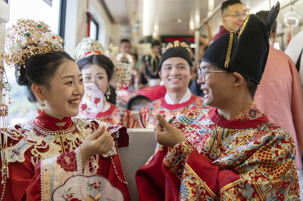 2024年8月10日,新人参加由浙江省金华市民政局与金华市轨道交通集团有限公司联合举办的“缘起金轨、爱在七夕”集体婚礼。新华社发(胡肖飞摄)