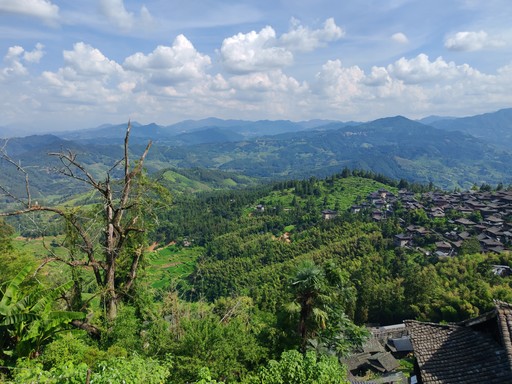 环抱在树林里的岜沙苗寨。陈录晖 摄