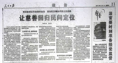 2010年2月10日,《人民日报》发表了题为《慈善事业告别“法律真空”(调查)》的报道,其中提到江苏省第十一届人大常委会通过了我国第一部地方性慈善法规,即《江苏省慈善事业促进条例》,开创了我国慈善事业地方立法的先河。在《江苏省慈善事业促进条例》中首次对慈善的相关概念进行界定,如慈善组织、慈善活动、慈善募捐等。在此基础上该《条例》还对慈善组织的内部运行进行了明确规范,包括活动范围、财务管理、信息发布及组织终止后的财产清查等。