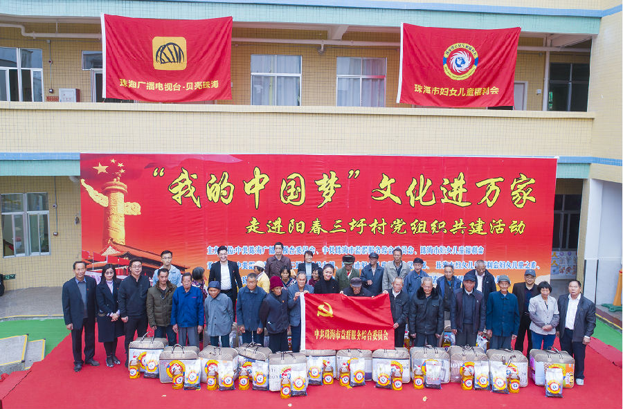 珠海市益群服务综合党委自2018年10月成立以来,切实加强社会组织党建,积极引领社会组织参与脱贫攻坚,动员社会力量助力珠海开展阳春对口帮扶工作。1月16日,珠海市益群服务综合党委及其直属党支部联合珠海广播电视台党委、珠海市妇女儿童福利会、珠海花泽雨文化传播有限公司、北京理工大学珠海学院航空学院等单位开展阳春对口帮扶——“我们的中国梦”文化进万家公益活动,向帮扶对象捐助资金和棉服、文具、米油、棉被、加热板等总价值近8万元的慰问物资。