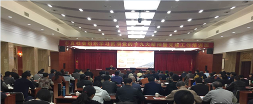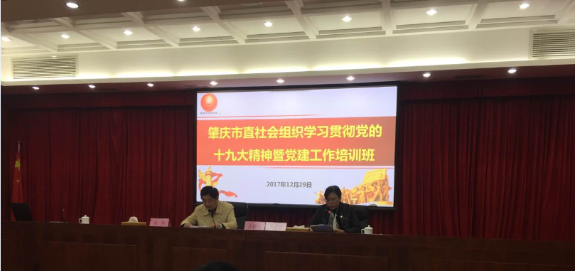 2017年12月29日,肇庆市社会组织党委在市政府小礼堂举办市直社会组织学习贯彻党的十九大精神暨党建工作培训班。市“两新”组织党工委专职副书记吴伟同志出席会议并讲话,市社会组织党委副书记兼纪委书记庞志坚同志主持开班动员并作小结讲话,市委讲师团教学教研室、市委党校有关同志应邀授课。