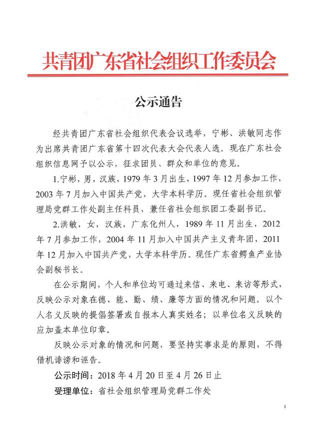 省社会组织团工委关于推荐宁彬、洪敏同志为共青团广东省第十四次代表大会代表人选的公示通告