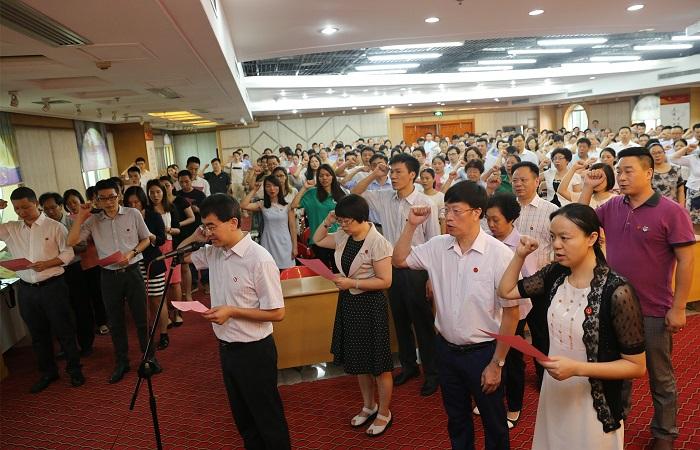 为进一步激励党员坚定爱党、信党、跟党走的理想信念,王福军同志带领新加入中国共产党的党员举行宣誓仪式,大家面对鲜红的党旗,郑重举起右手,庄严向党宣誓。参加会议的全体党员同志也起立重温入党誓词。