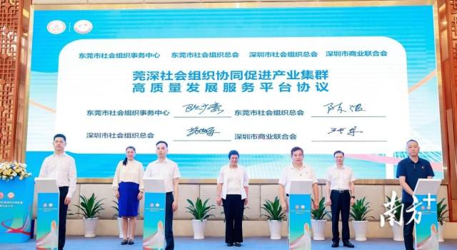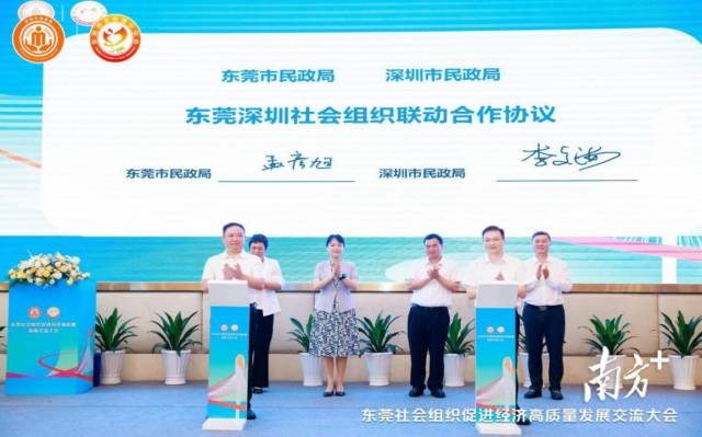 大会现场,举行了东莞、深圳两地有关社会组织合作签约仪式和授牌仪式。东莞市民政局与深圳市民政局签署了《东莞深圳社会组织联动合作协议》,东莞市社会组织事务中心、东莞市社会组织总会、深圳市社会组织总会、深圳市商业联合会等共同签署了《莞深社会组织协同促进产业集群高质量发展服务平台协议》,张晨、黎雪琴、李文海为首批加入莞深社会组织协同促进产业集群高质量发展服务平台协议的30家社会组织授牌。东莞市上市公司协会、深圳市钟表行业协会、东莞市电子信息产业协会作为莞深优秀社会组织代表发言。