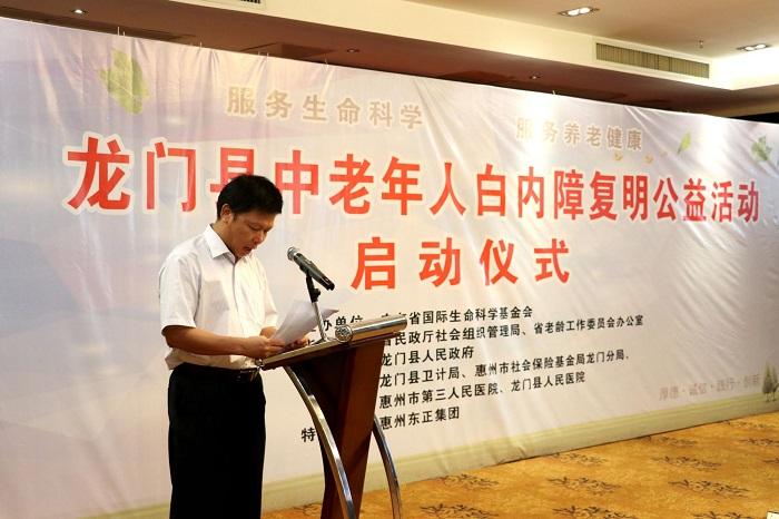 为促进养老健康公益事业的发展,帮助山区贫困的中老年白内障患者免费进行复明手术,发挥公益慈善事业在帮扶救济和医疗救助方面的作用,广东省国际生命科学基金会在龙门县开展救助贫困中老年人白内障患者的公益活动。此次公益活动是根据吴振钧会长的提议,由惠州东正集团公司董事长罗佑文先生向基金会捐赠人民币200万元。活动由广东省国际生命科学基金会主办,龙门县政府协办,龙门县卫计局、惠州市社保局龙门分局、惠州第三人民医院和龙门县人民医院承办,活动计划在年内完成。