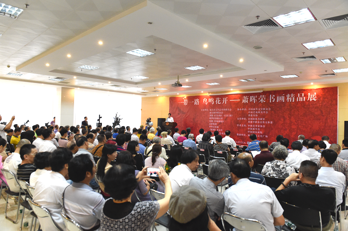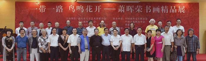 2016年10月28日下午,“一带一路 鸟鸣花开—— 萧晖荣书画精品展”开幕式在艺苑大厦三楼多功能厅隆重举行。开幕式由汕头市外事侨务局局长陈鹏主持,汕头市政协副主席、文联主席谢铿,中国画学会常务理事、四川省中国画学会会长刘朴,中国美协副主席、广东省文联主席、广东画院院长许钦松分别在开幕式上致辞,高度评价了萧晖荣的艺术造诣,和他爱国爱港爱家乡、崇德尚艺的精神。中国文联全委会委员、中国美协理事、香港美协主席、中国画学会顾问萧晖荣教授致谢词。萧教授陪同许钦松主席、中国画学会秘书长邓维东和中国美协原理事、中国画学会副会长谢志高共同为展览鸣锣开幕。出席开幕式的主要领导和嘉宾还有:汕头市人大常委会原常务副主任黄俊潮,市人大原副主任廖文松,市政协原副主席蔡婵英,中国画学会副会长张志民,广东省侨联副主席、汕头侨联主席谢惠蓉,潮汕著名画家肖映川、赵淑钦、陈延、蔡宝烈,知名企业家唐山市工商联副主席、老甲艺术馆馆长马鸿鸣等嘉宾。中国国家画院专门发来贺词,中国美协主席刘大为、国务院侨办副主任李刚、中国国家画院院长杨晓阳、香港新华社原副社长张浚生等均表示祝贺。此外还有媒体和社会各界人士共三百多人出席了开幕式,现场气氛十分热烈。