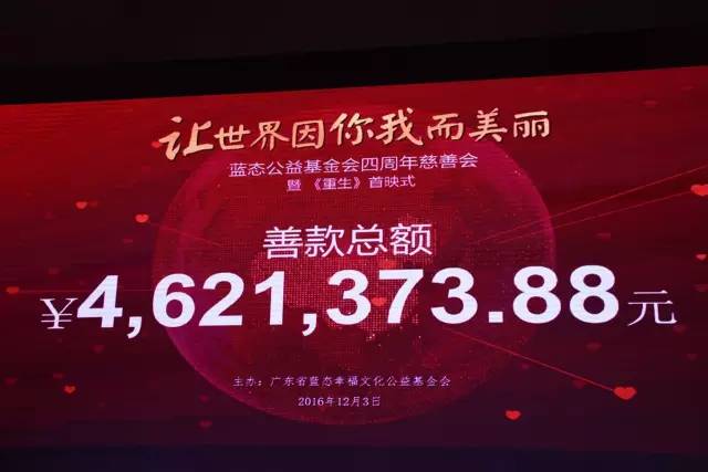 2016年12月3日,广东省蓝态幸福文化公益基金会在长隆酒店举办四周年慈善会暨微电影《重生》首映式,有关领导、大德老师、500多名来自社会各界的精英人士和200多名义工共同参加了这一盛会。