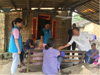 潭水镇社工站“双百”社工与村委会工作人员上门接送独居长者,将其转移到临时庇护所