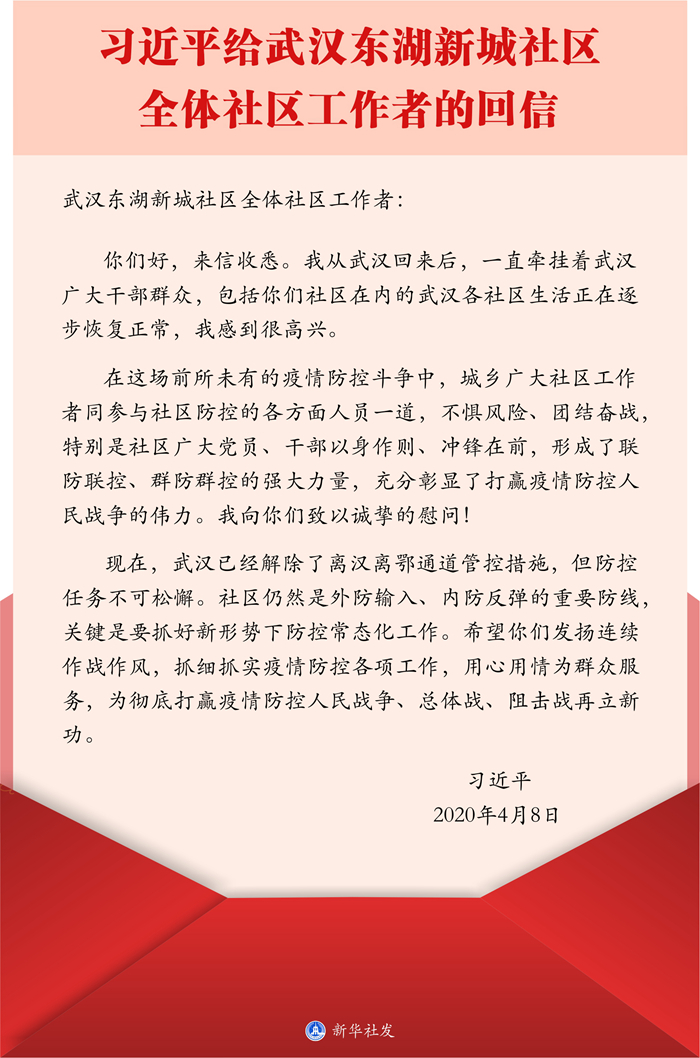 新华社北京4月9日电 中共中央总书记、国家主席、中央军委主席习近平4月8日给武汉市东湖新城社区全体社区工作者回信,再次肯定城乡广大社区工作者在疫情防控斗争中发挥的重要作用,向他们致以诚挚的慰问,并勉励他们为彻底打赢疫情防控人民战争、总体战、阻击战再立新功。