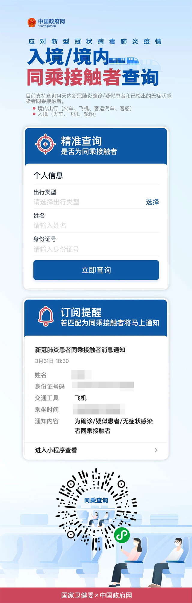 · 若你与新冠肺炎确诊/疑似患者或无症状感染者同一趟飞机、火车、客船、客运汽车,会及时提醒你。